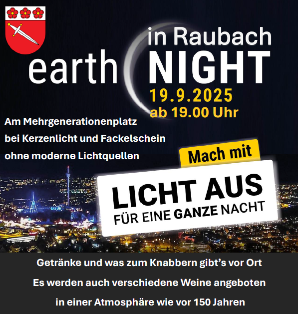 Am Freitag, den 19. September 2025, lädt die Gemeinde Raubach ab 19 Uhr zur stimmungsvollen Earth Night auf den Mehrgenerationenplatz ein. Unter dem Motto „Weniger Licht – mehr Nacht“ erleben Bürgerinnen und Bürger eine besondere Atmosphäre wie vor 150 Jahren – ganz ohne Straßenbeleuchtung, sondern bei Kerzenschein und Fackelfeuer.